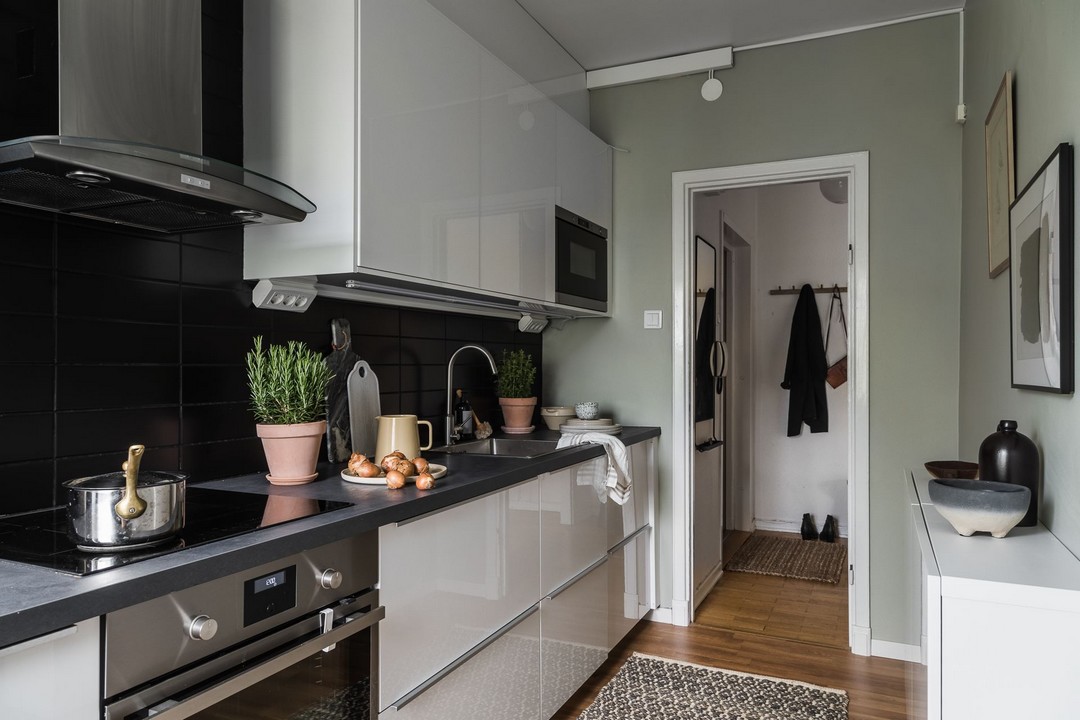 厨房一字型布局,后面空出来的地方加个窄柜,增加收纳空间,靠窗的地方还放了个小餐桌,是之前租客留下来的,放在这里平时也方便用个简餐。
